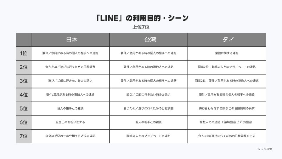 台湾とタイのユーザーは、LINEが職場での連絡に広く使われているほか、日本のユーザーに比べてグループ通話などの関連機能に対する認知度と利用率が高い。ちなみに日本のユーザーは家族や友人などとの連絡手段として利用している。