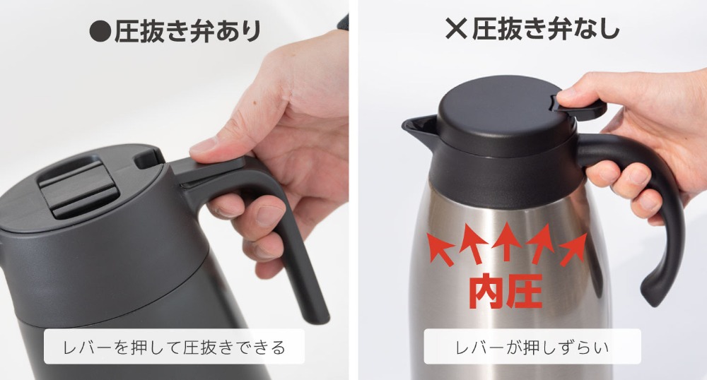 ハンドル部分は片手で注ぎやすいワンタッチレバー式を採用している。また、ハンドルに付いているレバーを押すことで内部の圧抜きも可能だ。圧抜きをすることで蓋が開けやすくなるほか、内圧による中身の吹き出しを軽減する。