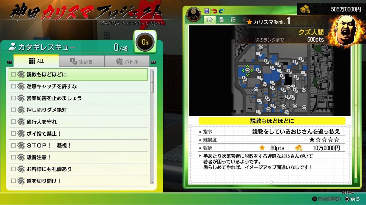 街で人助けなどの善行を行うことでポイントが溜まり、徐々に神田のカリスマが上がっていくという仕様だ。「カタギレスキュー」というネーミングセンスが何とも面白い。