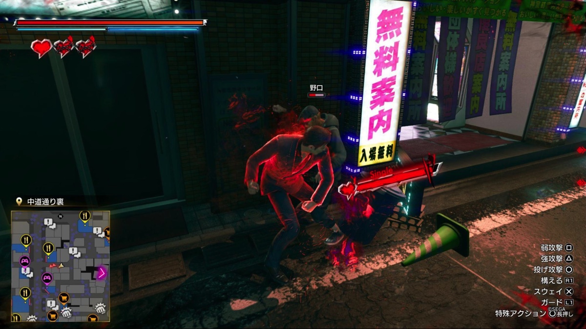 彼は普段はボクサーのようなスタイルで戦闘をするが、画面上部のハートマークが溜まった状態でR2ボタンを押すと「闇覚醒」という状態になり、非常に荒々しく重たい打撃を放つことができるようになる。普段は理性的なインテリヤクザだが、ここぞというときは己の闇を解き放ち、障害を打ち倒していく怖ろしい姿がアクションにも投影されているのだ。