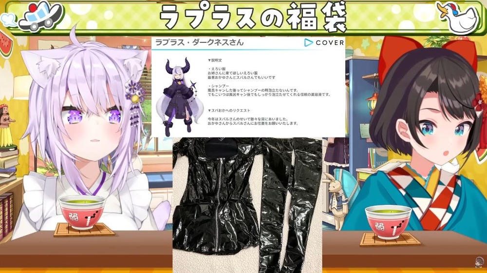 holoXのラプラス・ダークネスからは、「お姉さんに着て欲しいえろい服」としてエナメル製と思わしきテカテカの衣装一式が届けられ、大空スバルと猫又おかゆは大笑いで総ツッコミ。エンタメ精神強めなラプラスということで、元々なにかしでかしてくるであろう、と最初から身構えていたようだった。