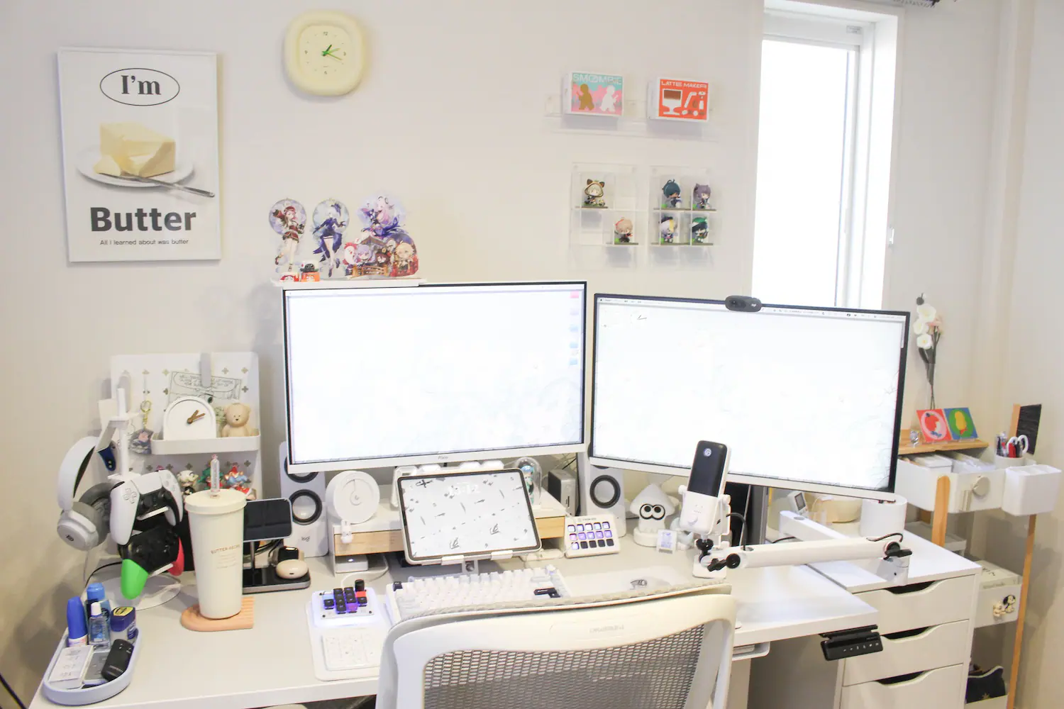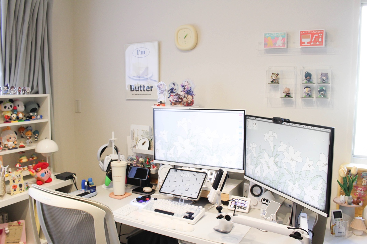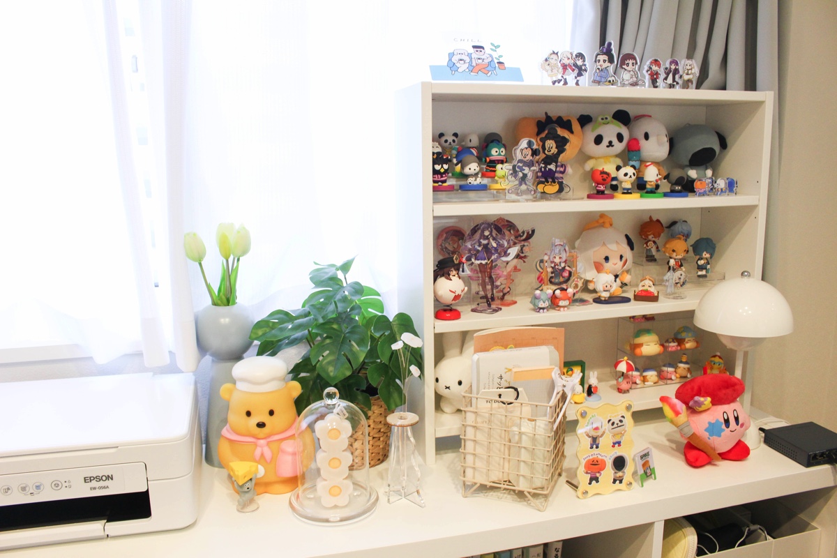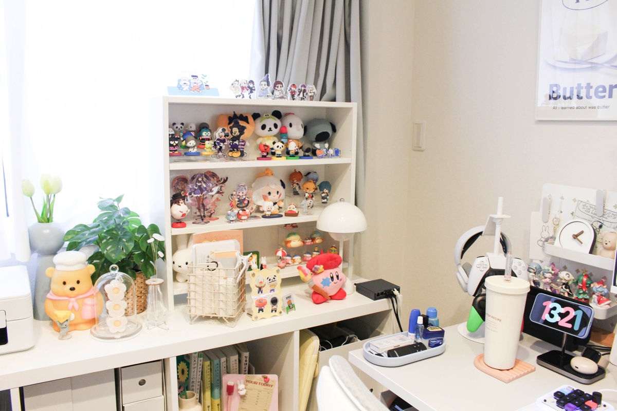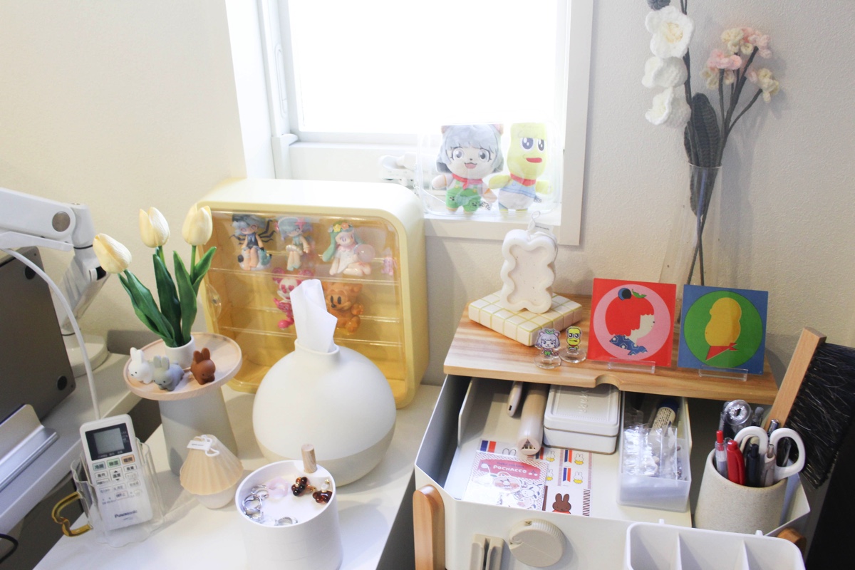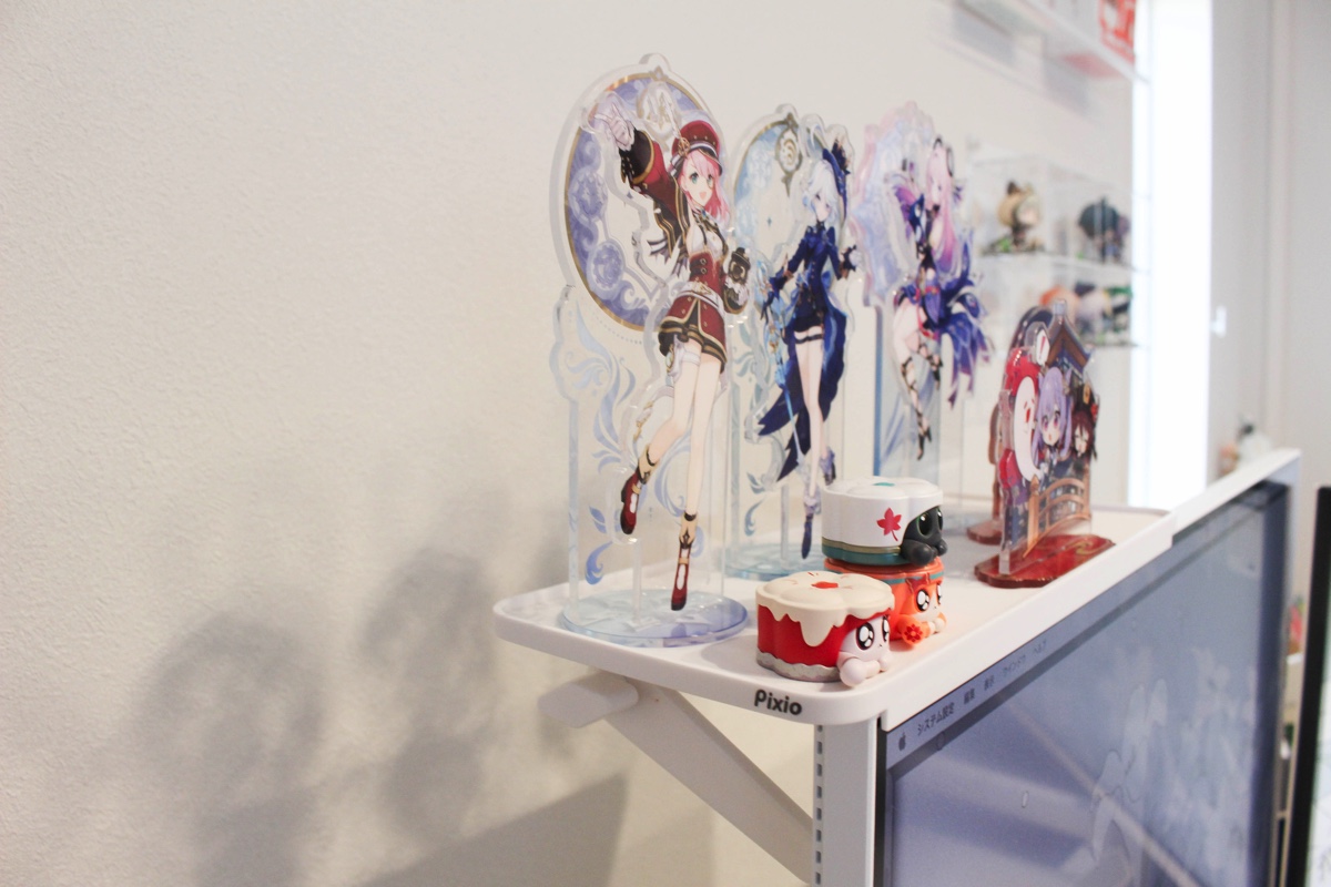 ひのふ:実はデスクを作る際、キャラクターやグッズが映える空間にすることを一番大切にしました。手持ちのグッズはカラフルなものが多く、そのまま並べると雑多な印象になりがちだったため、全体のベースカラーを白で統一したんです。色味を抑えることで、キャラクターや小物の色がより引き立つよう意識しました。その結果、自然とグッズが視界に入り、“可愛さ”と“作業のしやすさ”が両立したデスク環境になったと感じています。