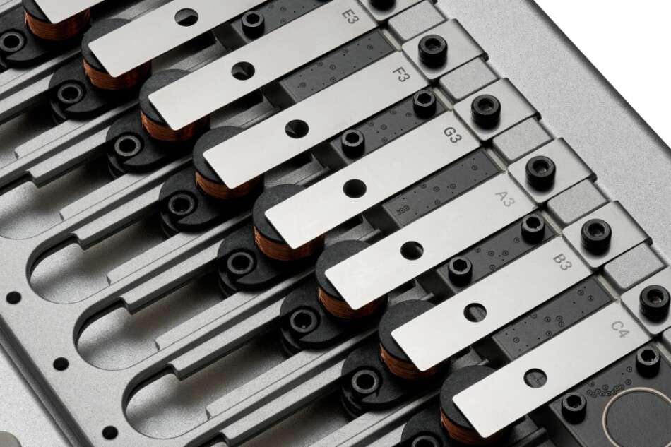 本製品は、実際に振動する物体そのものを音源とし、そこにシンセサイザーならではの電子制御を組み合わせる発音方式「アコースティック・シンセシス」を採用している。