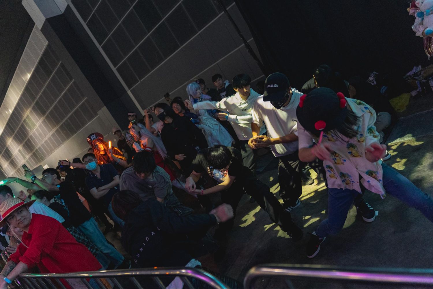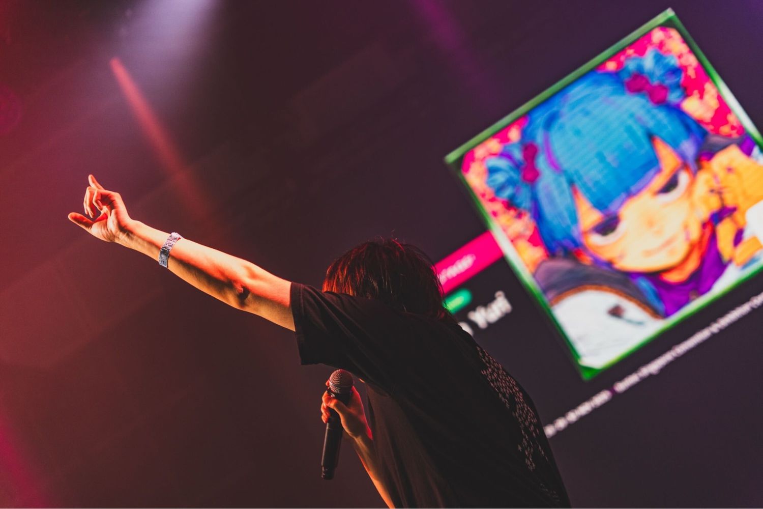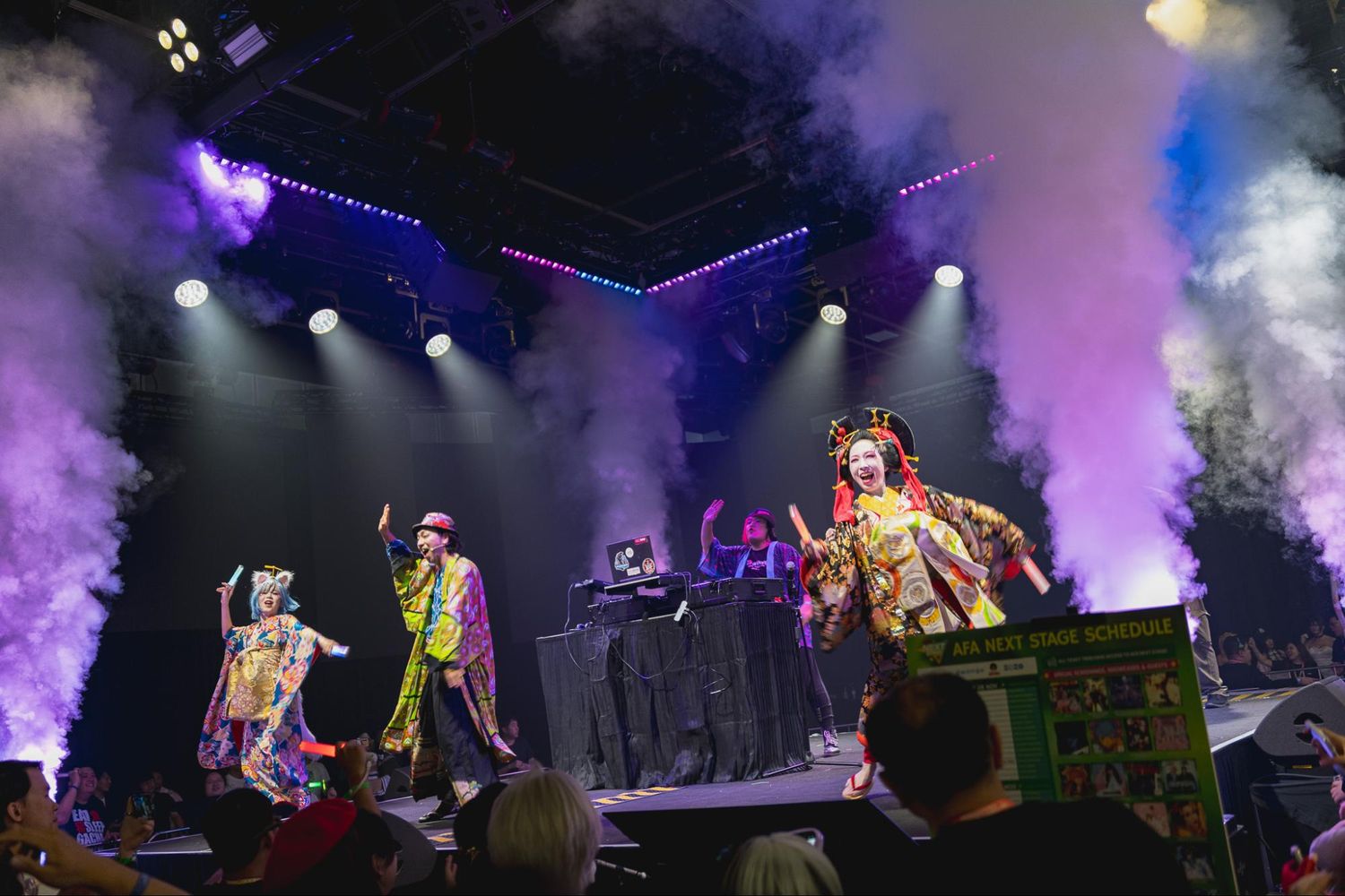 振付・ステージプロデュースを担当した日本舞踊家・振付師 孝藤右近-TAKAFUJI UKON- による丁寧な振り付け指導がなされると、「レッツゴー!陰陽師」「アイドル」などアニクラ御用達の楽曲と共にステージの周りをぐるぐると回る、踊る。途中、「ハム太郎とっとこうた」で盛り上がった観客たちが小走りでステージの周りを走る一幕もあり、選曲も相まってもはやニコニコ超会議の再来だな、国が違ってもオタクはハム太郎で回りたくなっちゃうんだなと、謎のシンクロニシティに思わず笑ってしまった(単にネットで出回っている動画の影響かもしれないが)。参加のしやすさで場の空気をあたため、楽しそうな輪があるから入りたくなる。空気としても動きとして“好循環”を連日見ることができた。