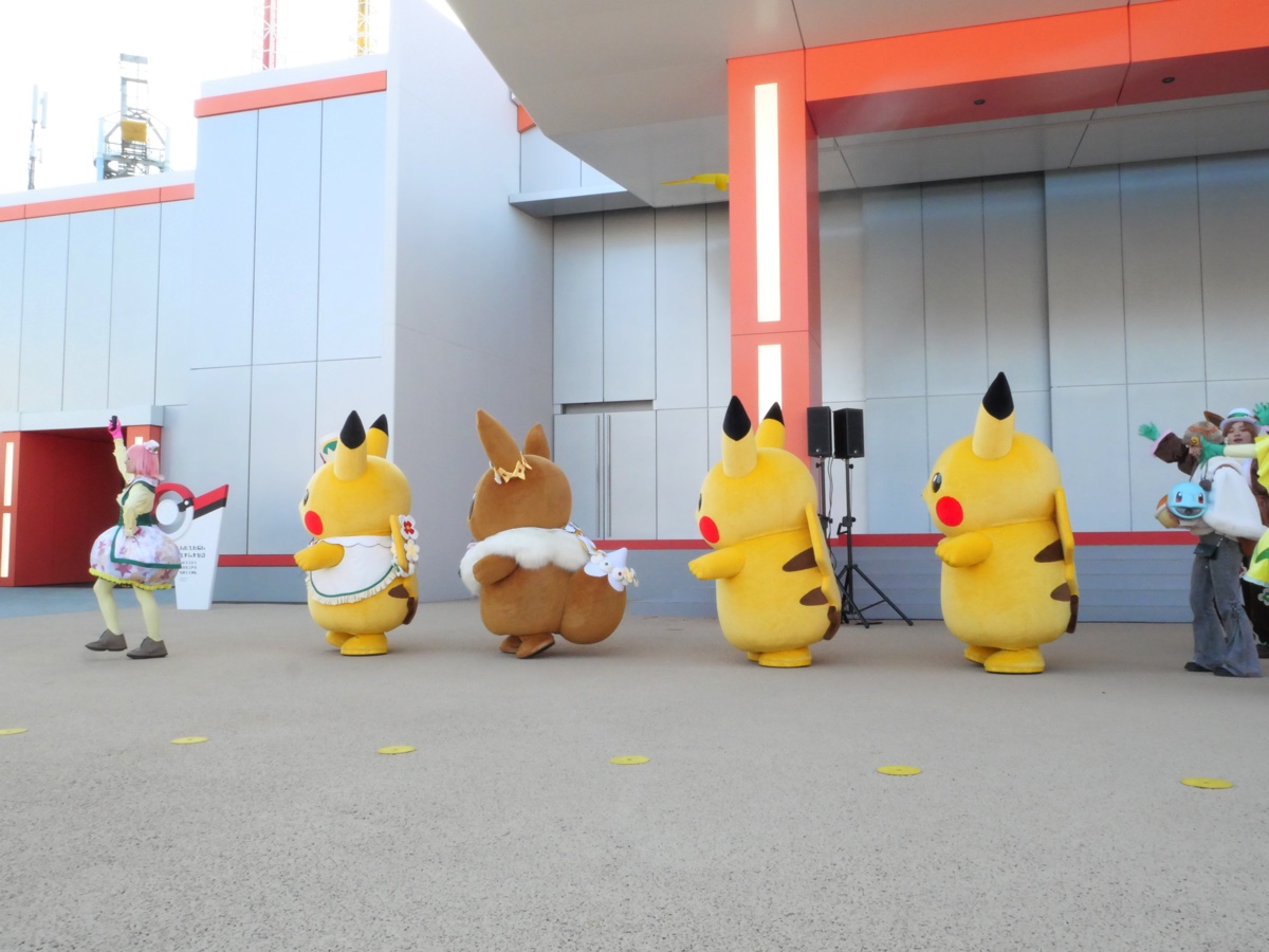 そして『カヤツリジム』前に集合し、パレード「ピカブイバブルカーニバル」を見学。ダンサーとともに踊るピカチュウとイーブイたちがパフォーマンスを披露してくれるのだが、短い手足を一生懸命駆使していて可愛い……! 最初は『カヤツリジム』前のステージで踊り、ヨチヨチと行進して噴水前へ移動し、フィナーレとなった。