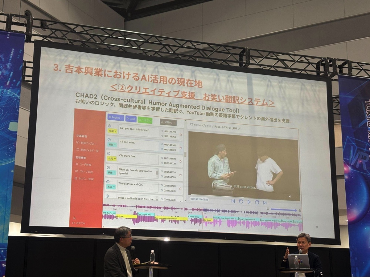 言語・文化の拡張では、独自のお笑い翻訳システム「CHAD 2」(Cross-cultural Humor Augmented Dialogue Tool)が紹介された。お笑いのロジックや関西弁などを学習させた翻訳システムで、通常の機械翻訳では訳せないニュアンスを再現する。たとえば「バイトの子が飛んじゃって」というセリフは、通常のAI翻訳では「fly out」と直訳されるが、CHAD 2では「He ran away」と文脈を理解した訳になる。「やっぱそうっすね」も「Yes, that's right」ではなく「I knew it」とネイティブに伝わる表現に変換される。