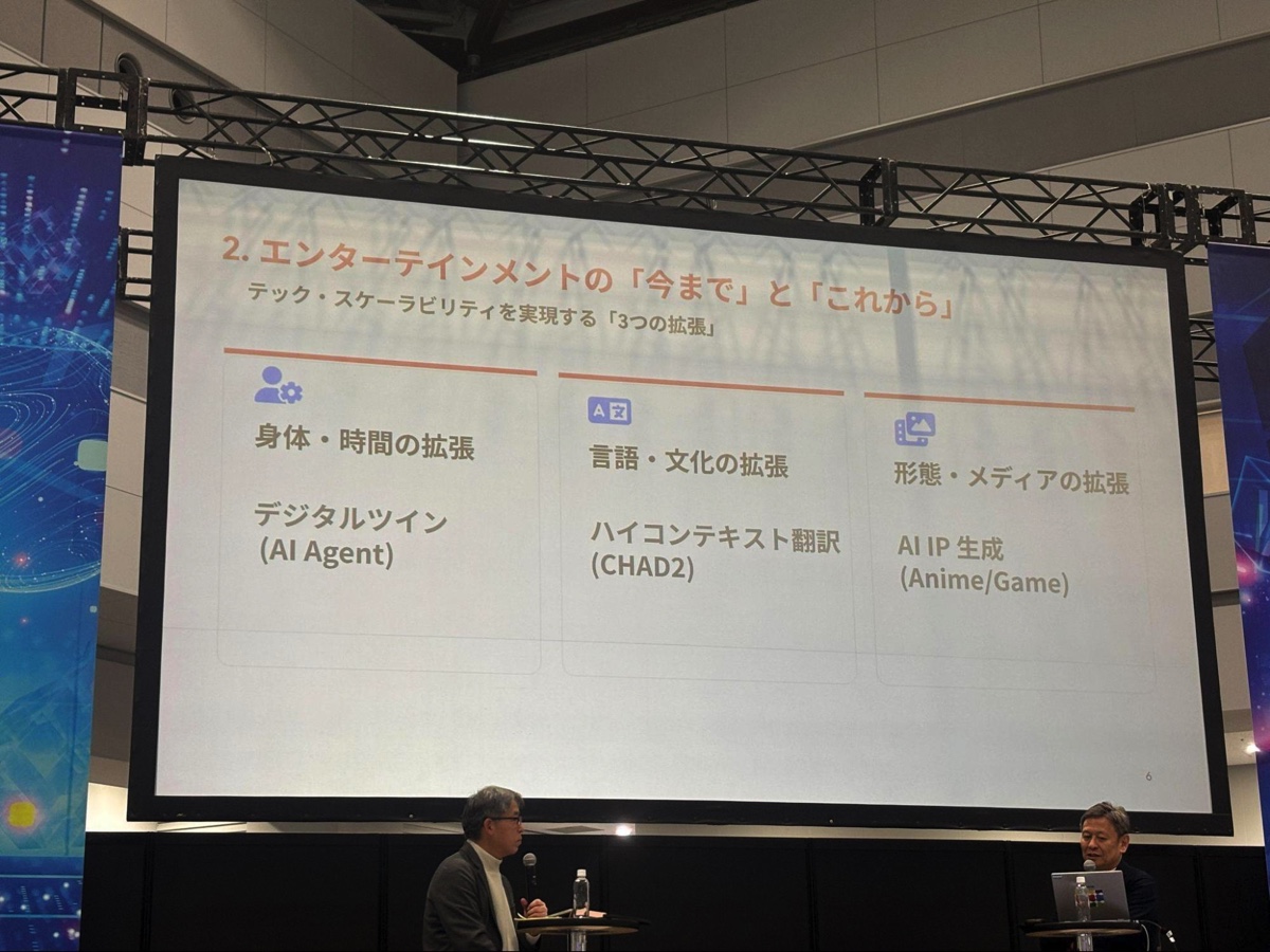 セッションでは、FANYが取り組むAI活用の具体像が紹介された。梁氏は、テクノロジーによってエンタメのスケーラビリティを実現する「3つの拡張」として、「身体・時間の拡張」(デジタルツイン)、「言語・文化の拡張」(ハイコンテキスト翻訳)、「形態・メディアの拡張」(AI IP生成)を挙げた。