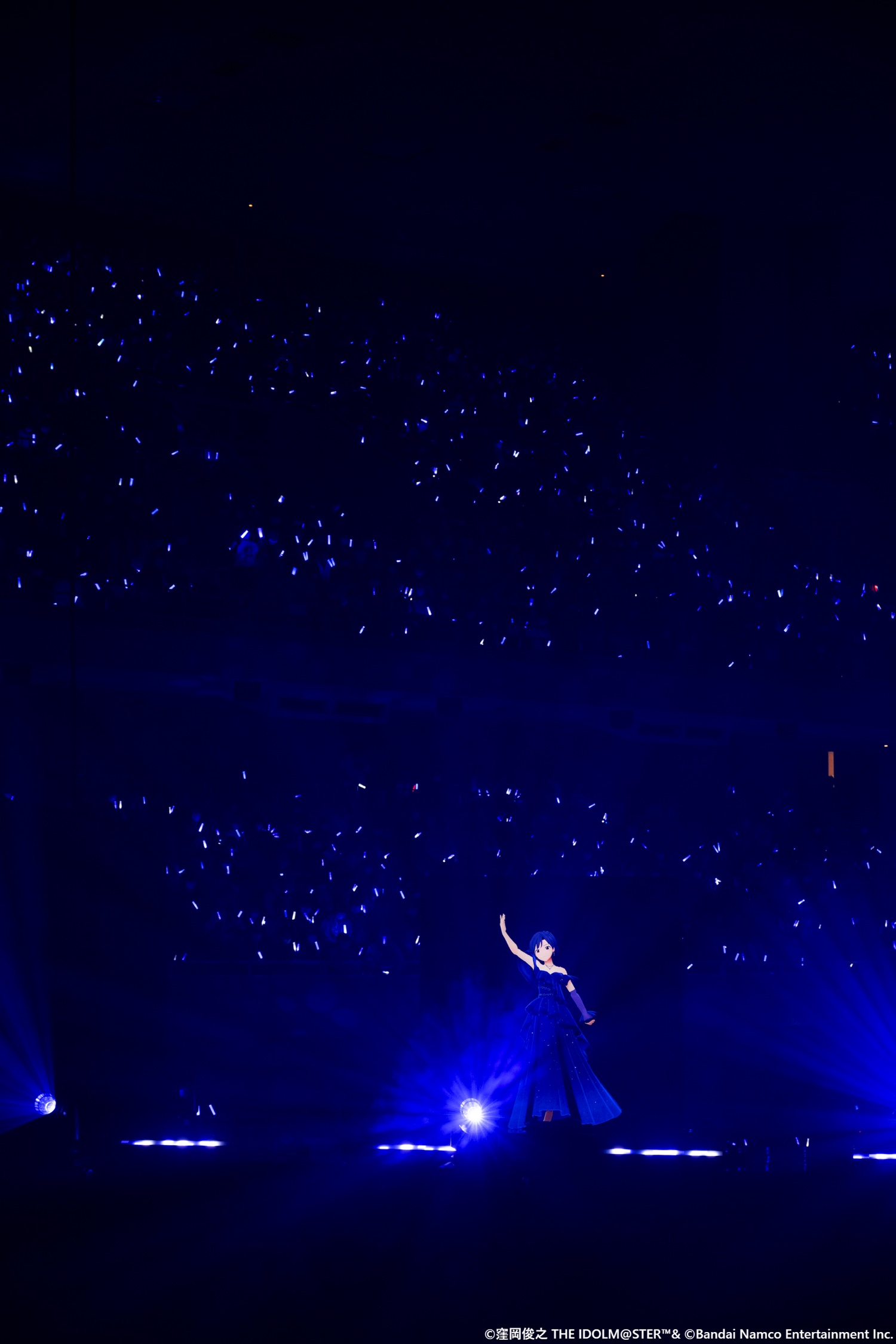 この演出を簡単に実現しようと思ったら花道の上に横長のモニターを設置すれば事足りるわけだが、実際に会場で『groovots』大型モデルによるこの光景を目の当たりにしてみるとインパクトは絶大。直前まで視界を遮るものがなかった空間に突如として千早が現れ、左右の客席に手を振りながらゆったりと歩いていく姿には、平面モニターでは出せない臨場感があったように思う。観客席からも「ヤバっ!」との声や、思わず息を呑むような空気を感じた。