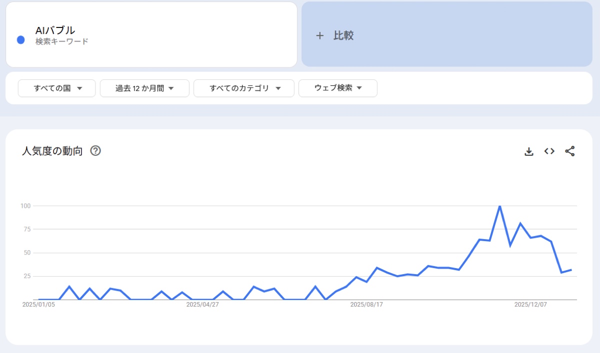 2025年に誕生したAI業界のバズワードとして、「AIバブル」がある。このワードは同年11月頃よりさかんに語られるようになり、現在でも断続的に言及されている(以下のGoogleトレンドのグラフも参照)。