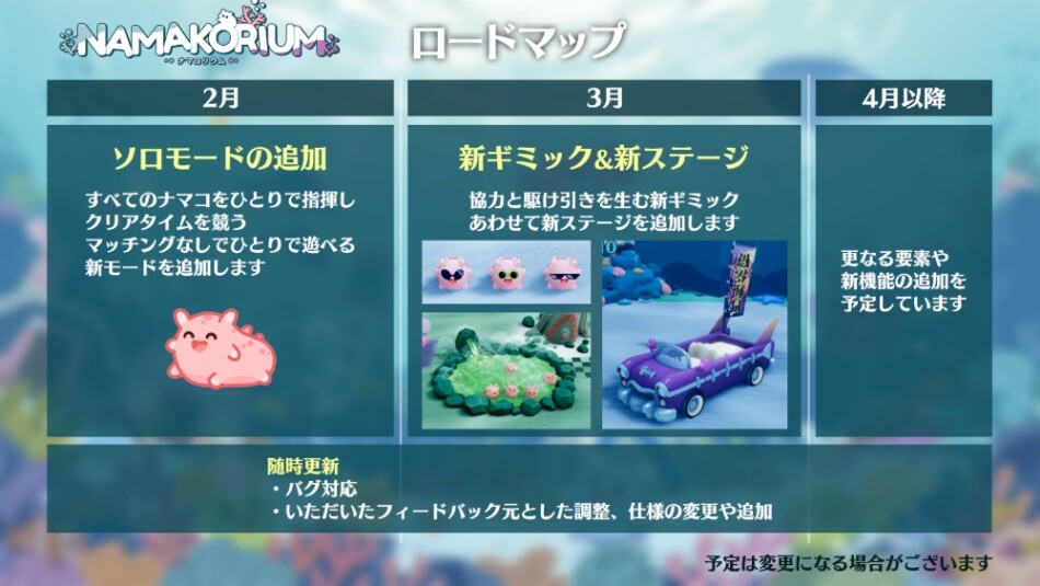 アーリーアクセスの提供を開始し、その後の開発ロードマップを公表した。要望として多数あったソロモードは2月に実装され、3月に新ギミックと新ステージが公開される予定だ。