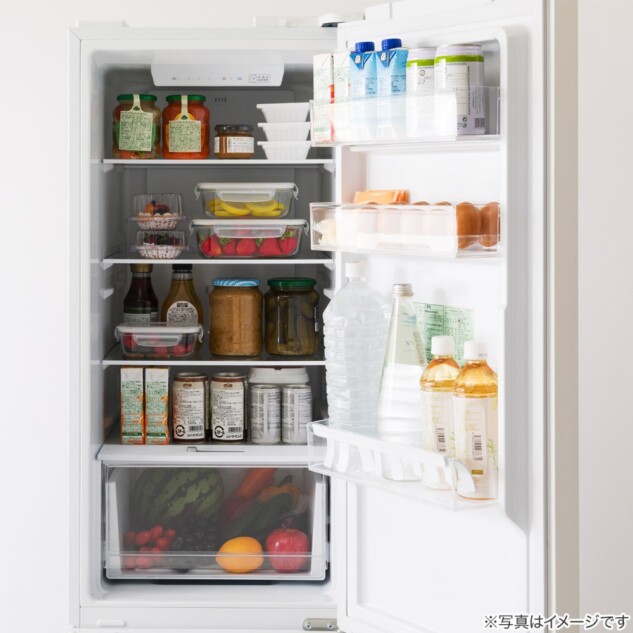 庫内には高さ調節が可能なガラス棚を採用し、2Lペットボトルも収納できる整理しやすいドアポケットを搭載している。製氷皿に加えて貯氷ボックスも付属しているため、氷のストックもそのままできる。