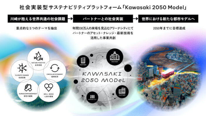 元沢:さらに、もうひとつ言うのであれば、今回のプロジェクトは「Kawasaki 2050 Model」として、持続可能な街の開発というのをコンセプトのひとつにしています。「Kawasaki 2050 Model」とは、DeNAと川崎ブレイブサンダースが、パートナー企業との共創を通じて社会課題の解決に挑む社会実装型サステナビリティプラットフォームです。川崎が抱える課題を基に、世界共通の社会課題から5つの重点テーマを選定し、「Kawasaki Arena-CityProject」を舞台に様々なパートナー企業との共創による社会実装を通じて2050年までに設定したゴールを達成し、世界における都市の新たなモデルになることを目標としています。要は、このアリーナシティを舞台に、パートナー企業との共創を通じてさまざまな社会課題の解決に挑み、次世代の都市モデルを目指そうという。そういう意味で、多くの企業と一緒に、今回のアリーナづくりに挑みたいと思っているんです。