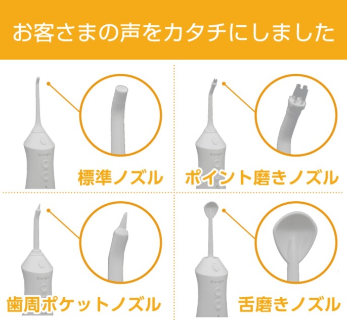 標準ノズル(2本)のほか、ポイント磨き、歯周ポケット、舌磨きの計4種5本のノズルを同梱しているため、用途に合わせて使い分けが可能だ。