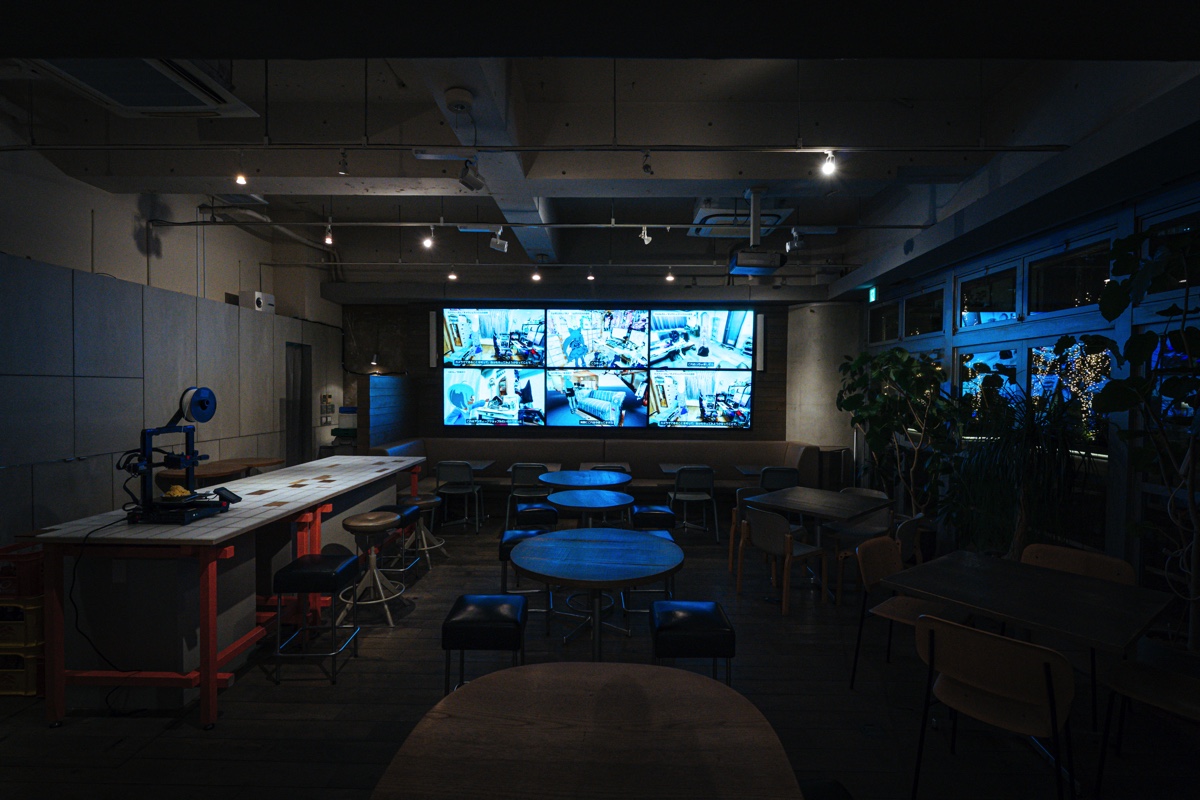 今回の展示で特筆すべきは、このゲームを軸とした体験が、モニターの中だけで完結しないということ。本展ではFabCafe Tokyoの空間そのものが「架空の不動産屋」として演出されており、来場者はスマートフォンを片手に、カフェ内の家具や日用品に擬態した妖怪「モノバケ」を探し出すことになる。