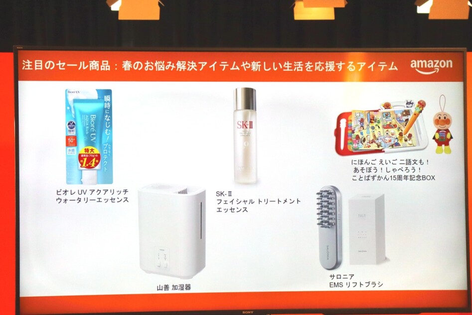 紫外線や花粉症といった悩みに寄り添うアイテムとして、紫外線対策の日焼け止めや花粉対策に役立つ加湿器も対象になっているほか、新生活に備えたビューティーアイテムとして、SK-IIのスキンケアや表情筋を鍛えるサロニアの美顔器、パナソニックの電動歯ブラシなども用意しているとのこと。