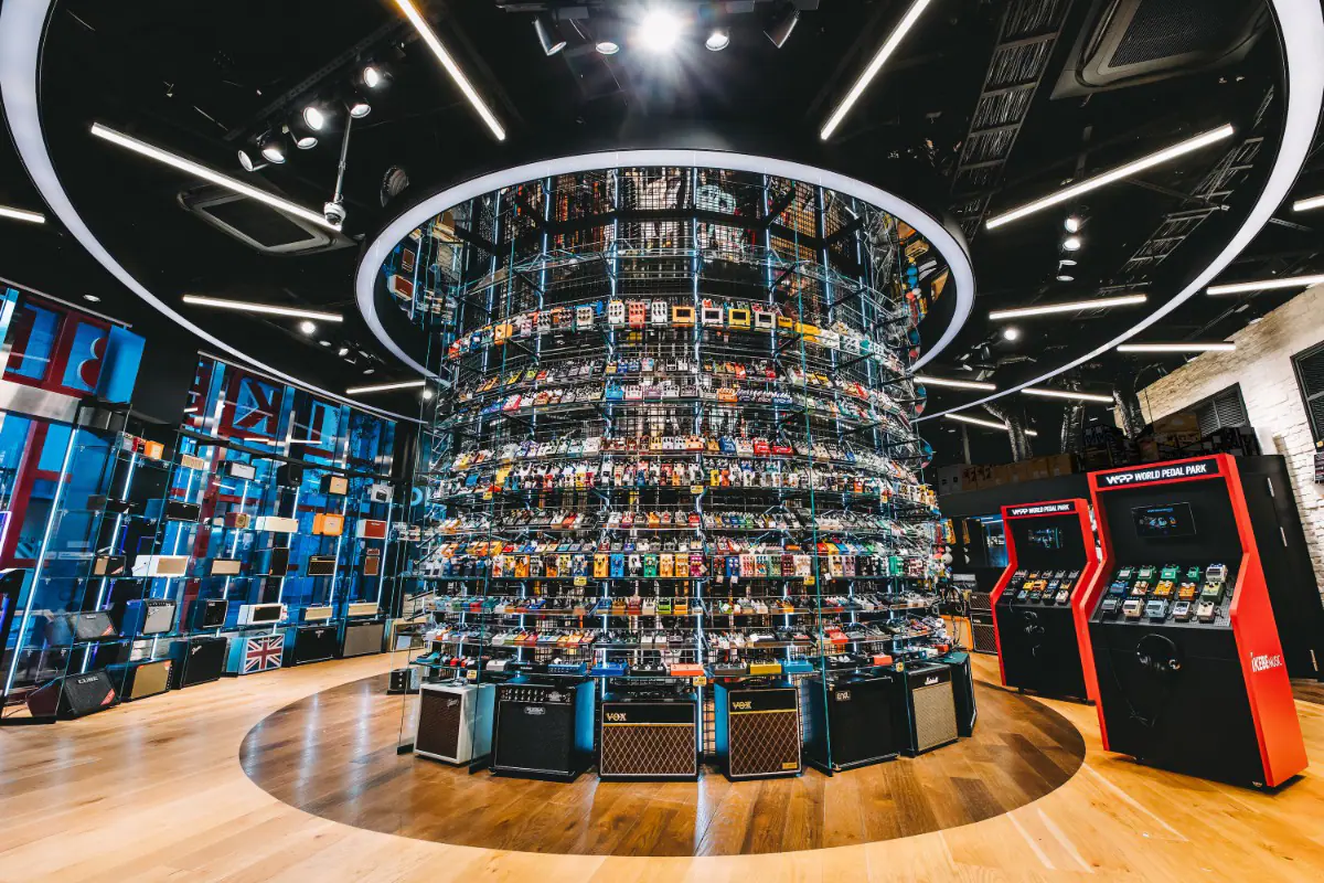 「WORLD PEDAL PARK(WPP)」は、2000台規模のエフェクターペダルが並ぶ「ペダルタワー」を中心に、誰でもギターを繋がずにエフェクターペダルを試せる「ペダルボックス」を備えた体験型ストアだ。