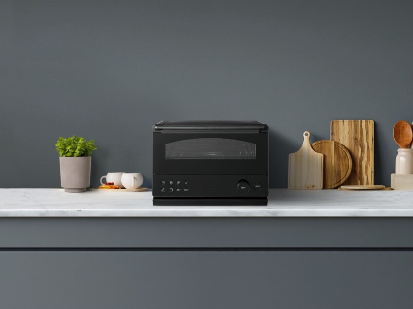 同製品は、庫内を3Dドーム構造とし、アルミ鏡面仕上げによって熱を効率的に反射することで、食材にムラなく熱を伝える設計となっている。0.2秒で発熱するグラファイト式ハイスペックヒーターを上下に搭載し、高温で一気に焼き上げることで、約60秒でトースト1枚を焼き上げる。