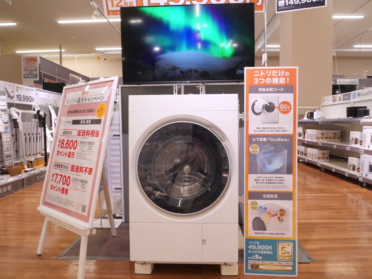 インテリアや家具のイメージが強い『ニトリ』で、いま“大型家電”が好調だ。ドラム式洗濯乾燥機を筆頭に、ファミリー向けの冷蔵庫やエアコンといった商品が売れ行きを伸ばしているという。