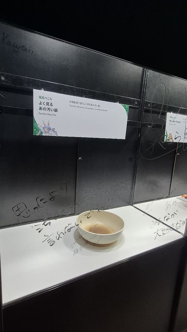 展示されていたアイテムのなかで特に話題をよんだのは、兎田ぺこらの「よく見るあの汚い鍋」。料理配信でほぼ確実に登場する、薄っすらと焦げた鍋。ファンにとっても思い出深いアイテムが展示されていることがSNSを通じて広まると、多くのファンがひと目見て写真に収めようと集まっていた。