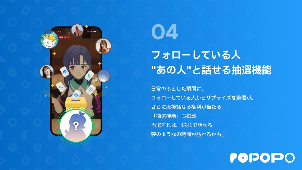 『POPOPO』は、スマートフォン向けの通話アプリ。カメラや特別な準備を必要とせず、会話をするだけでプロ監督監修のカメラワークが自動生成され、日常の通話が映像作品のように演出されるのが特徴だ。