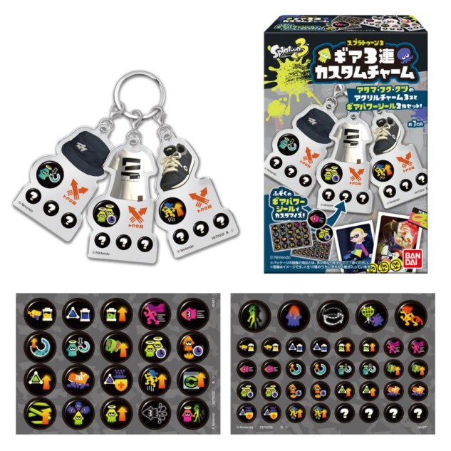 本商品は『スプラトゥーン3』に登場するギアが3連アクリルチャームになったものだ。ギアパワーシールを使うことで、ゲーム同様にアクリルチャームをカスタマイズできる。複数購入と付属のリングパーツを組み合わせることでコーデを組み合わせられる作りだ。