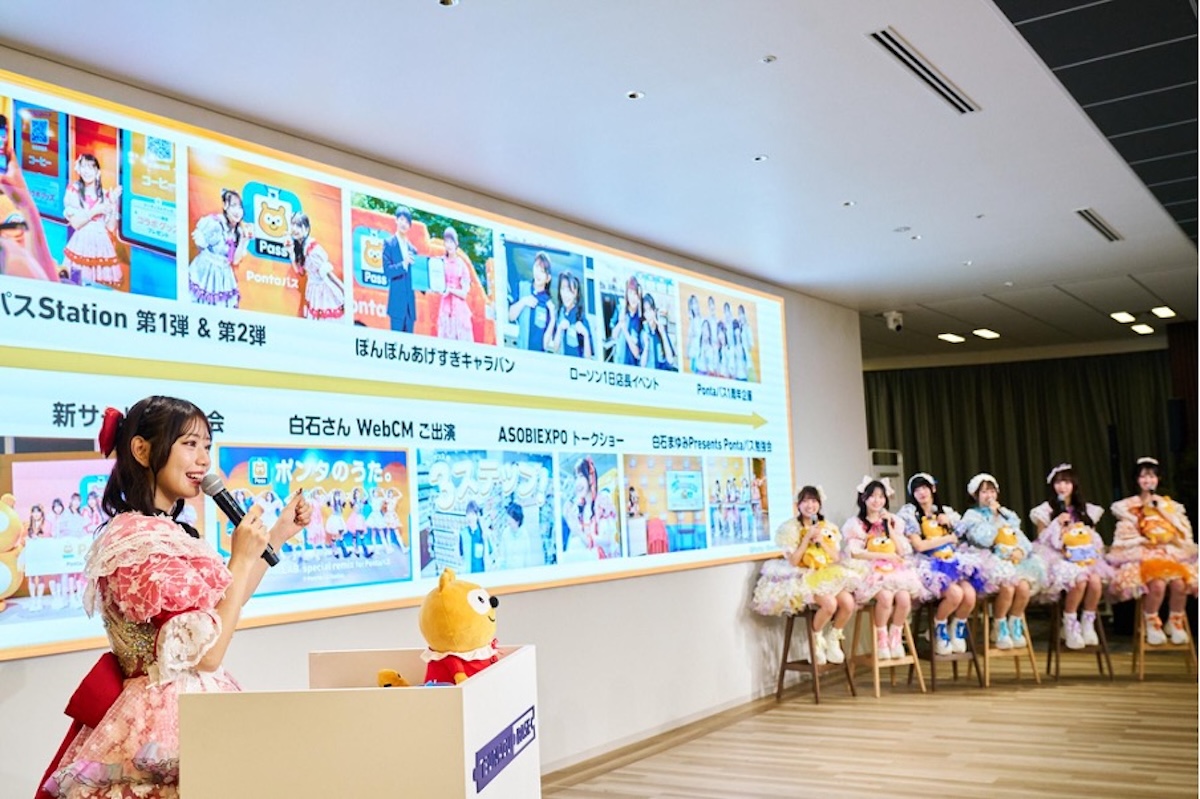 まずはメンバー7人がポンタのコラボぬいぐるみを抱えて登場。昨年10月に行われた1周年記念会見にて白石はコラボグッズの制作を発表しており、念願叶って完成したぬいぐるみに嬉々とした表情を浮かべる。