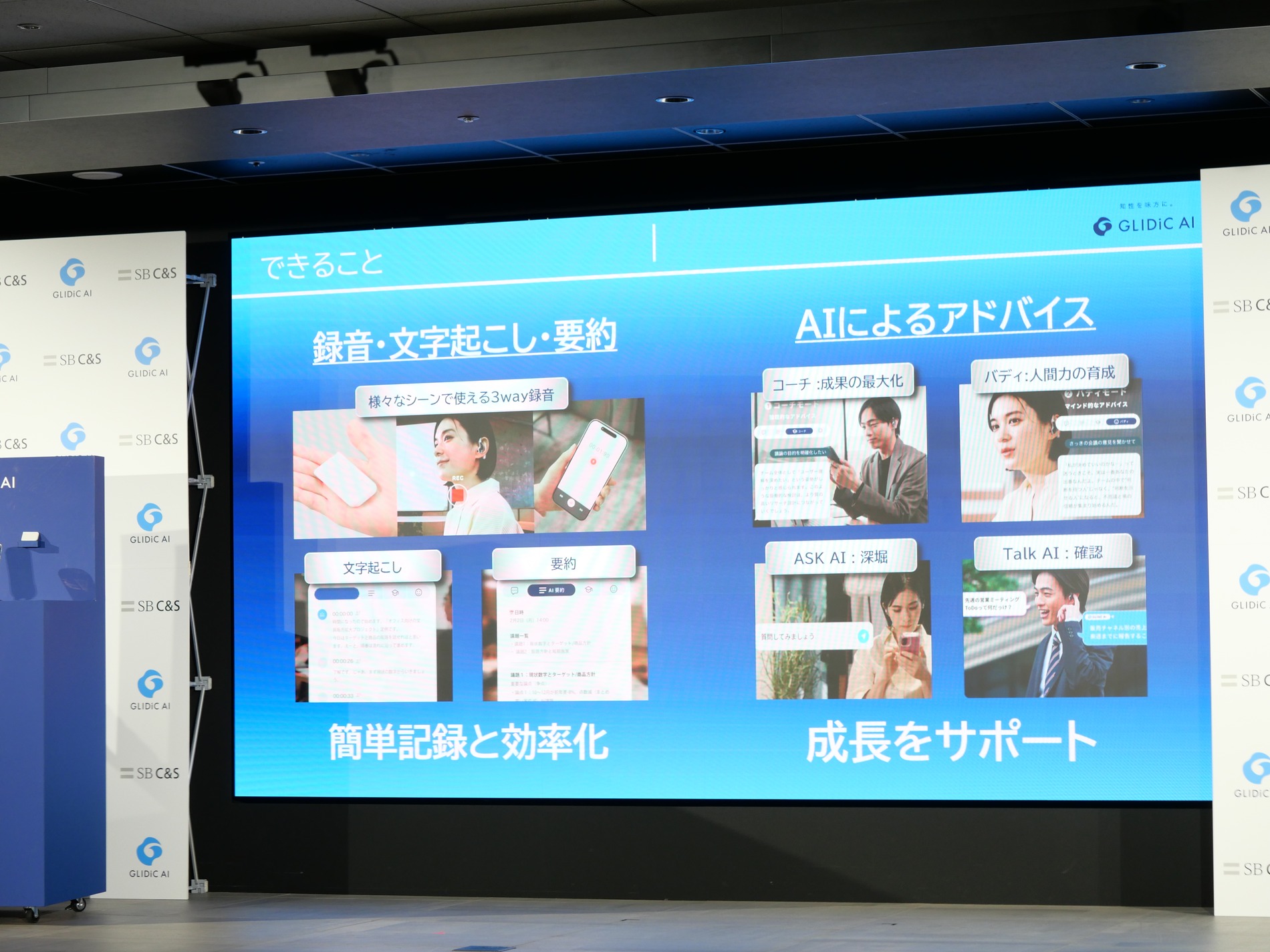 録音はイヤホン、薄型レコーダー、専用スマホアプリの3way方式に対応し、会議や外出先、オンラインなどで利用可能。薄型レコーダーはケースに一体化して収納できる設計となっている。専用アプリでは事前に性別や年代、業界・職種・立場・目標・課題・声紋を登録する。登録された声から自分の発言を認識し、GLIDiC AI独自のテクノロジーにより時系列も把握。蓄積された録音データの内容とプロフィールを照らし合わせ、物事の進展やユーザーの発言の変化を読み取ることで、アドバイスもパーソナライズされていくという。