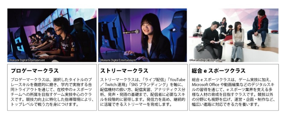 KONAMI eスポーツ学院は、第一学院高等学校eスポーツコースとしての学びを3年間提供するサポート校だ。これまで「プロゲーマークラス」「総合eスポーツクラス」の2クラスを展開してきたが、2027年度入校生からは2年次の選択科目として「ストリーマークラス」が加わる。