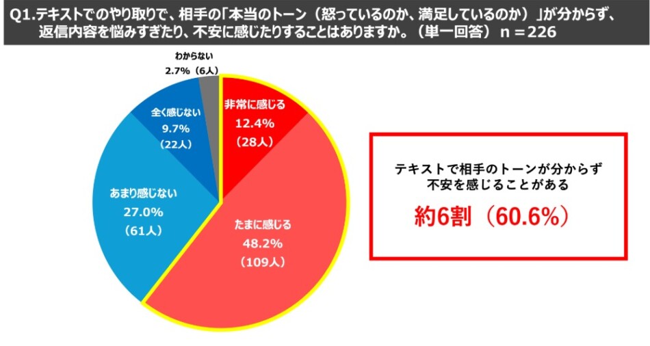 テキストコミュニケーションに関する質問では、チャットやメールなどのテキストコミュニケーションだと相手のトーンが分からず不安を感じると回答した人が約6割(60.6%)にのぼった。