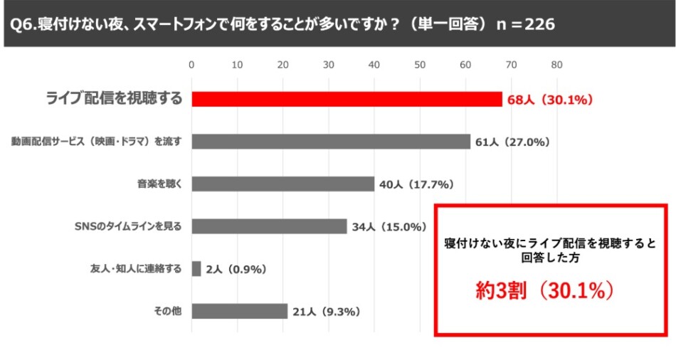 新生活シーズンの夜に関する質問では、4割以上(44.2%)が環境の変化による不安や孤独で「寝付けない夜」があると回答。寝付けない夜のスマートフォンでの行動については、「ライブ配信の視聴」が30.1%で1位となり、映画やドラマなどの動画配信サービスの視聴(27.0%)を上回る結果となった。