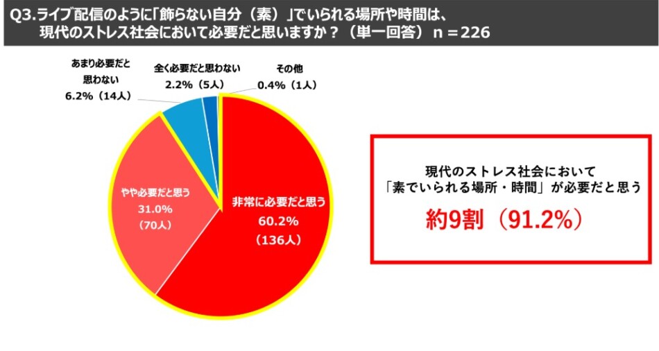 さらに、現代のストレス社会において「飾らない自分(素)」でいられる場所や時間が必要かという質問に対しては、9割を超える91.2%が必要であると回答している。