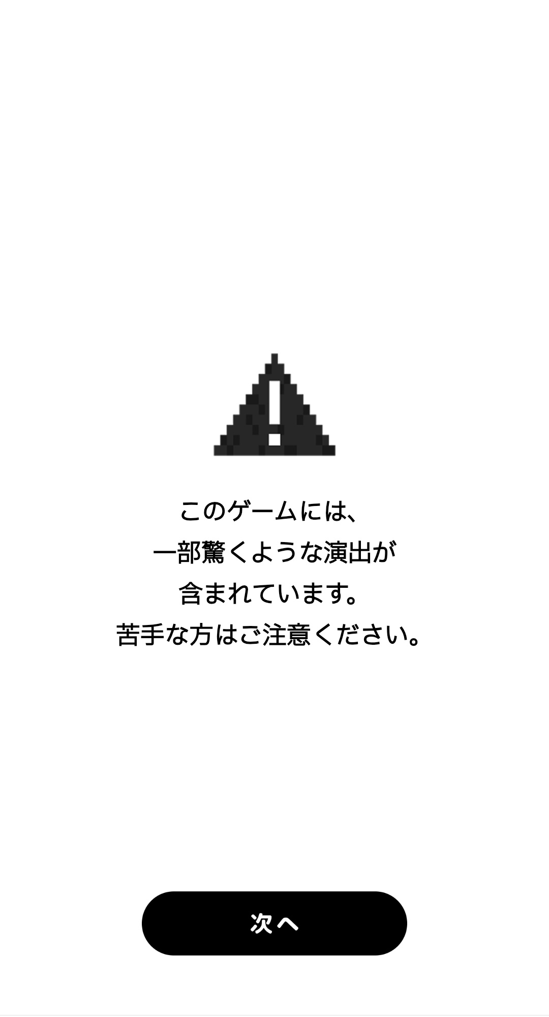 はじめに、スタート画面をタップすると、「このゲームには一部驚くような演出が含まれています。苦手な方はご注意ください」という警告文とともに、「音声をONにすると、より楽しめます」というアドバイスが表示される。
