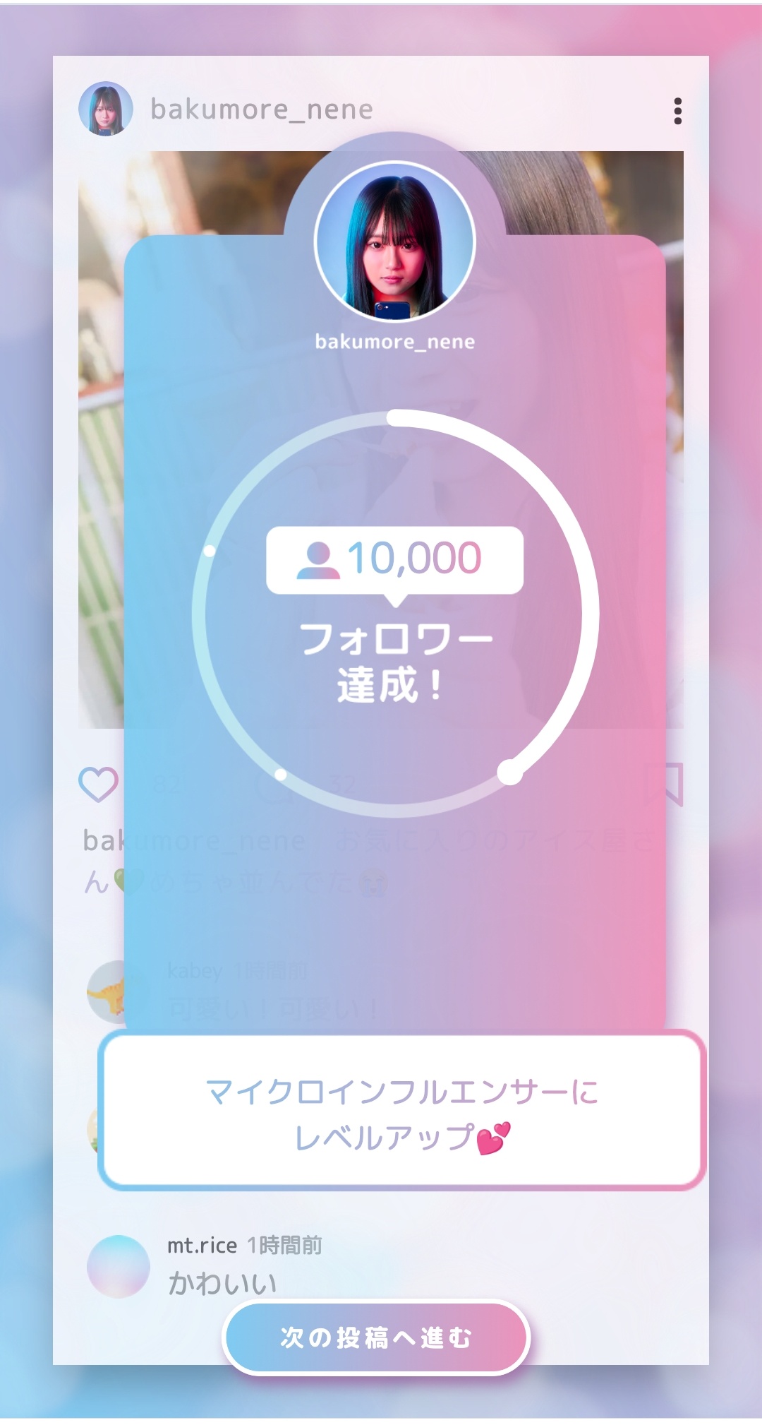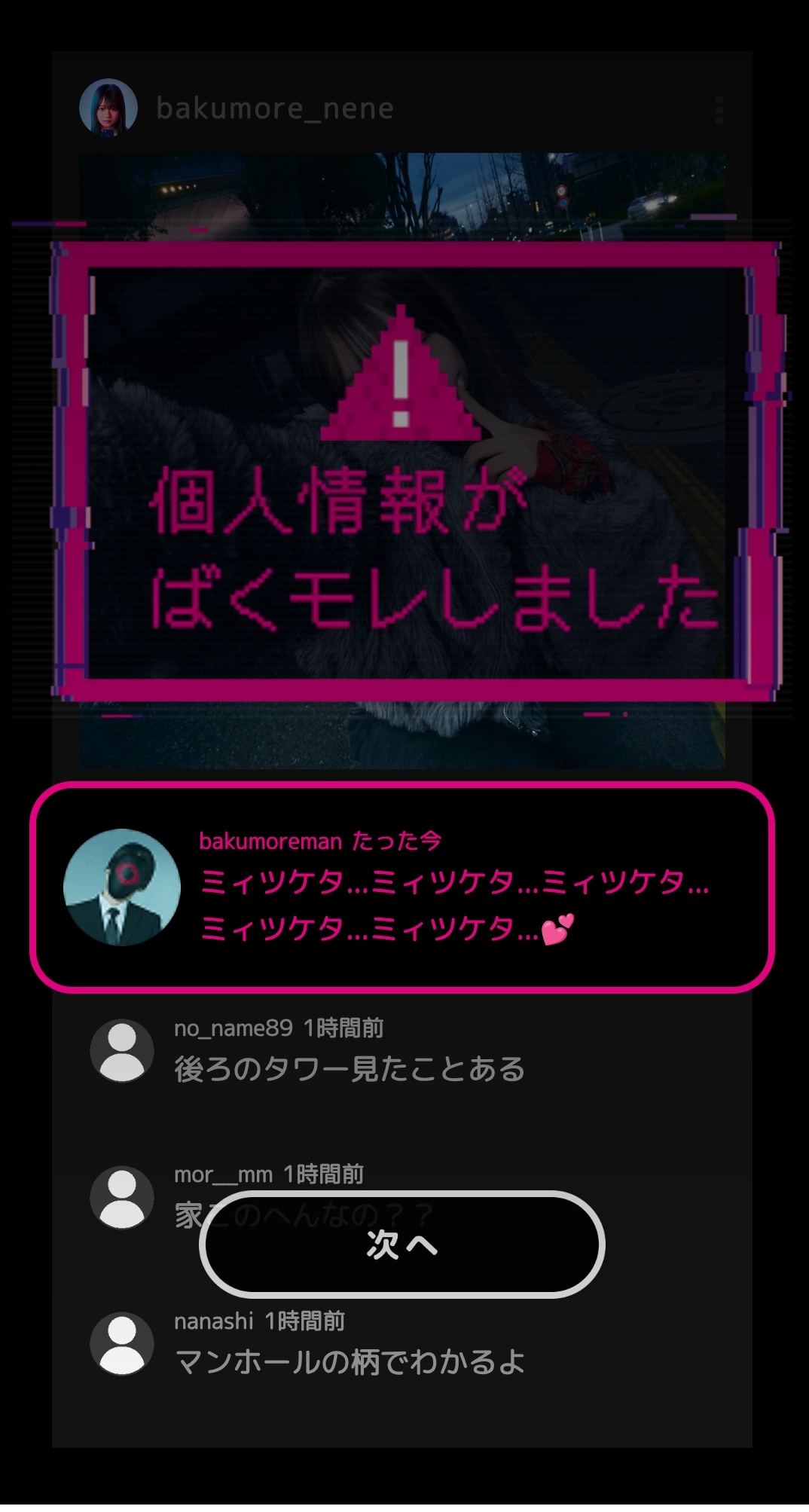 いったい、どんな演出で驚かせてくるのか……。身構えながら進めていくと、SNSに投稿する写真を3枚の候補の中から、1枚タップして選ぶことになる。バズを狙うのであれば、一番可愛く写っている写真をアップすればいいのでは?――そんな考えでなんとなく映りの良い写真を選んだところ、フォロワーから「かわいい!」など絶賛コメントの嵐。それに気をよくしていたのもつかの間、画面に突如としてノイズがかかって警告音が鳴り響く。