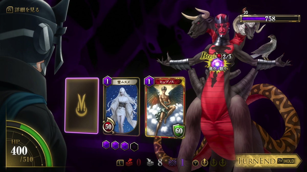 本作のジャンルは「デッキ構築タワーダンジョン」。その名の通りカードバトルがメインに据えられており、山札から3枚の神魔札(カード)を手札に加え、「オド」と呼ばれるリソースと引き換えに神魔札の効果を発動していく。なお、新たな神魔札は戦闘パート終了後やフロア内で発生するイベント等(後述)で獲得できる。神魔札の取捨選択を行いつつ、プレイスタイルを考えながらデッキを組む楽しさは本作の大きな魅力の一つだ。