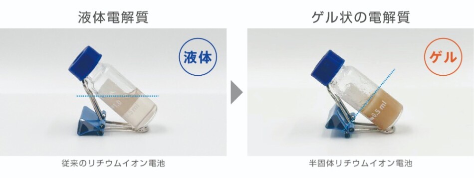 半固体電池は、従来の液体電解質をゲル状に変更した電池だ。可燃性成分の揮発が抑えられ、ガスが放出されにくくなることで安全性が向上している。電解質以外の素材にも安全性の高い素材や加工が施されている。