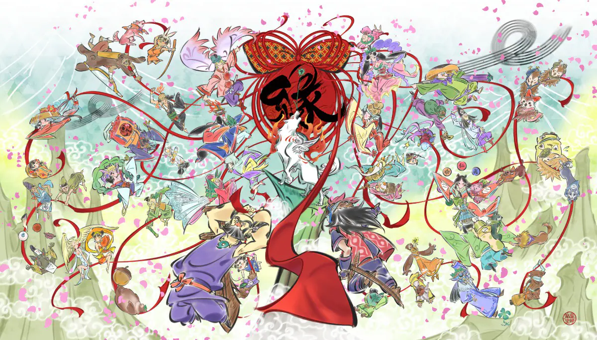 赤いリボンで『大神』のキャラクターたちとファンとの“縁”を表現し、アマテラスを中心に個性的なキャラクターたちが並ぶアートに仕上がっている。イラスト内の“縁”の筆文字は、『大神』のロゴをデザインした書道家・成田眞澄氏が揮毫した。