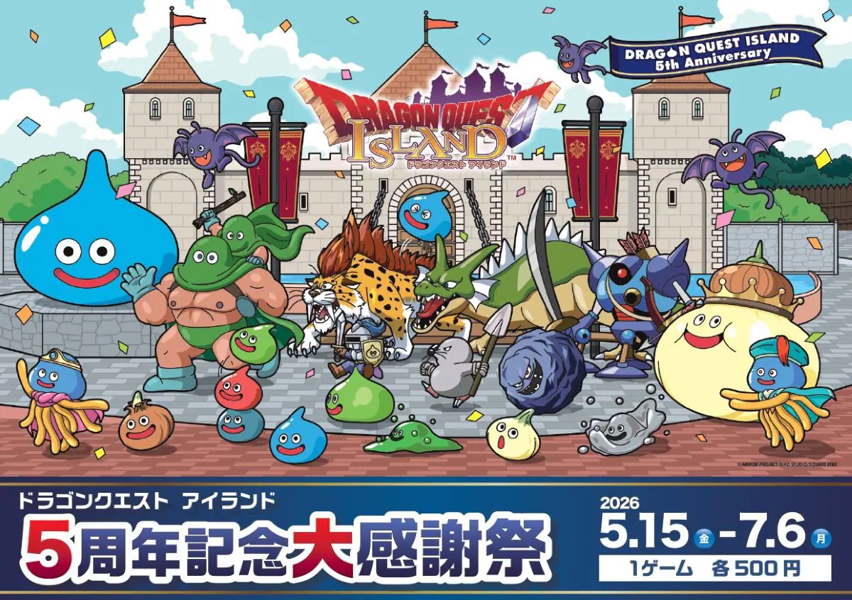 同アトラクションは2026年5月15日にオープンから5周年を迎える。これを記念し、4月17日から7月13日にかけて「ドラゴンクエスト アイランド 5周年記念大感謝祭」と題したスペシャルイベントが開催される。
