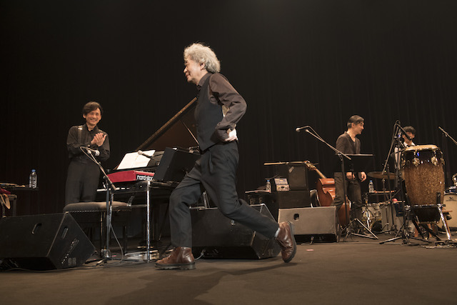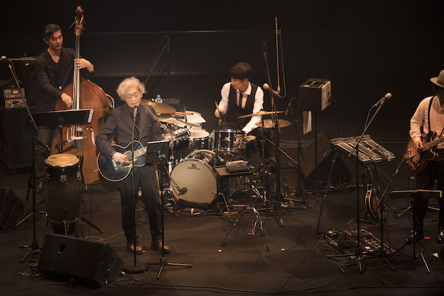 そして、ついに細野晴臣のライブがスタート。バンドメンバーの高田漣(Gt)、伊賀航(Ba)、伊藤大地(Dr)がキューバ出身の作曲家アルモンド・オレフィチェのペンによる「La Conga Blicoti」を演奏するなか、細野は客席前方の扉から登場し、コミカルなステップを踏みながらステージに上がり、軽やかさと奥深さを兼ね備えたボーカルを響かせる。ラテン風味のリズムに絡む日本語の歌詞、口笛のメロディも絶品だ。