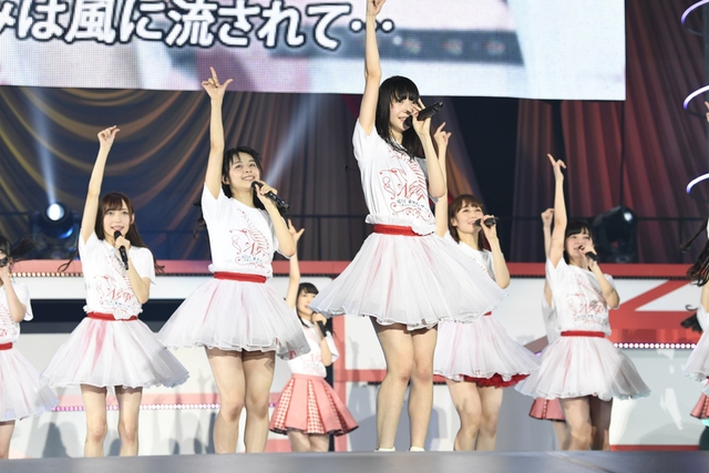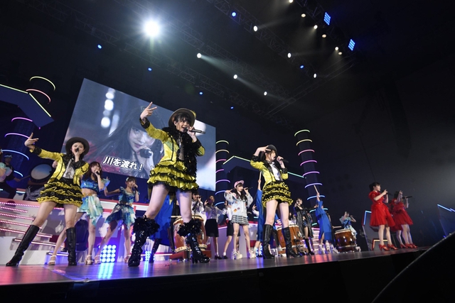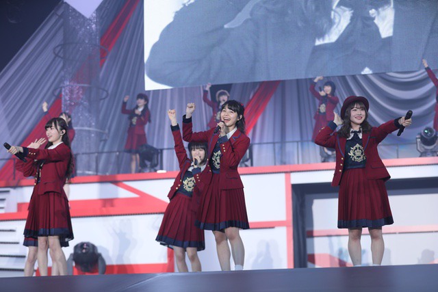 かと思えば、加藤美南がアクロバットを繰り広げた「赤いピンヒールとプロフェッサー」をはじめ、「パレオはエメラルド」、「Glory days」と、北原がかつて兼任していたSKE48の楽曲が次々に飛び出したり、乃木坂46の「制服のマネキン」が高倉萌香をセンターに据えてパフォーマンスされたり、後半には「青春のラップタイム」(NGT48)や「桜、みんなで食べた」(HKT48)、「思い出せてよかった」(STU48)を据えたりと、無邪気に姉妹グループ・坂道シリーズの垣根すら超えてみせる。そこから小熊・西村・村雲颯香と新潟万代太鼓飛龍会が万代太鼓を打ち鳴らし、重厚な音をバックに「RIVER」「NGT48」が歌われた。この流れには、48グループの意志を“継承”しながら、同時に坂道シリーズへの“回答”でもあるNGT48が、それらのグループを上回るオリジナリティを打ち出していくのだ、という決意表明のようなものを感じさせられた。