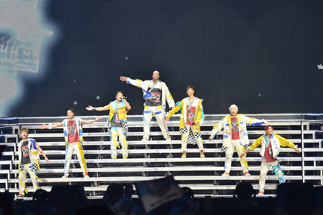 船出をしたGENERATIONS号は、アジア、アメリカ、ヨーロッパ、そしてジャパンへと巡る旅を繰り広げる。その行く先々にある音楽文化を取り入れながら楽曲を披露していくさまは、GENERATIONSが培ってきた豊かな表現力を示すものになった。彼らのパフォーマンスに合わせて、観客が振る水色×白色のフラッグも、GENERATIONS号を進める風や波に見えてくるから不思議だ。そう、今GENERATIONSにはいい風もいい波もキテるのだ。メインステージに出現した巨大な帆を前に登場した7人は「UNITED JOURNEY」から「AGEHA」「ALRIGHT! ALRIGHT!」と、アッパーチューンでその“勢い“を見せつける。