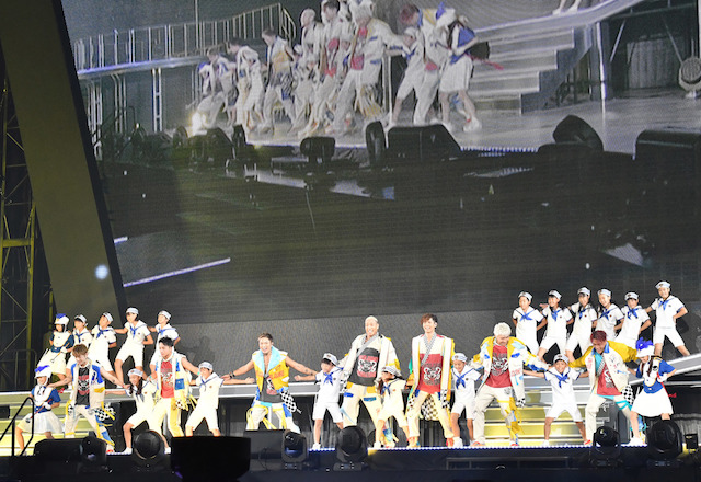 続く、「Hard Knock Days」では龍友がドラムを叩き、メンディーがラップで焚きつける。筋骨隆々の二の腕、炎の特効……レギュラー番組『GENERATIONS高校TV』(AbemaTV/テレビ朝日系)で、度々肉を巡って争う肉食男子コンビがGENERATIONSの“強さ“を、これでもかとぶちかす。かと思えば、しなやかな涼太のハモリが加わって、これぞ剛柔併せ持つGENERATIONSの“深み“と、惚れ惚れする展開。勇ましいシーンを見せたかと思えば、今度は「Always with you」でキッズダンサーたちと青空をバックに突き抜けるような爽やかなステージを見せたり、「PIERROT」で艶めかしい仮面武道会を披露したりと、様々な顔を見せてくれる。堂々とソファに腰掛けた亜嵐と玲於の滴る色気は、きっと彼らの積み上げてきた自信を比例しているのだろう。「Love You More」ではフロートに乗り込み、女性ダンサーとカップルダンスを披露。密着度の高い振り付けに会場からは悲鳴も。そんなファンの素直な反応に涼太が少しニヤリとする、意外とSな一面もチラ見えした。