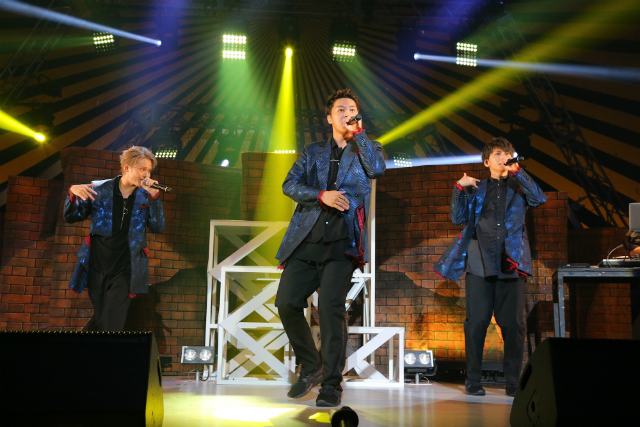 ホーンのサウンドが艶やかな「Bumblebee」で幕を開けたライブ。この日の客席には、2013年にグループを卒業したリーダー・中土居宏宜のイメージカラーである赤のサインライトが目立った。宏宜の卒業以降、「いつも心にUpturnと赤色を」を掲げて活動してきた彼らの思いについてはブログでも触れられているが、2曲目「What cha gonna?」で、黄色・青・緑という3人のメンバーカラーを組み合わせた照明が赤一色に替わる演出にはハッとさせられるものがあった。