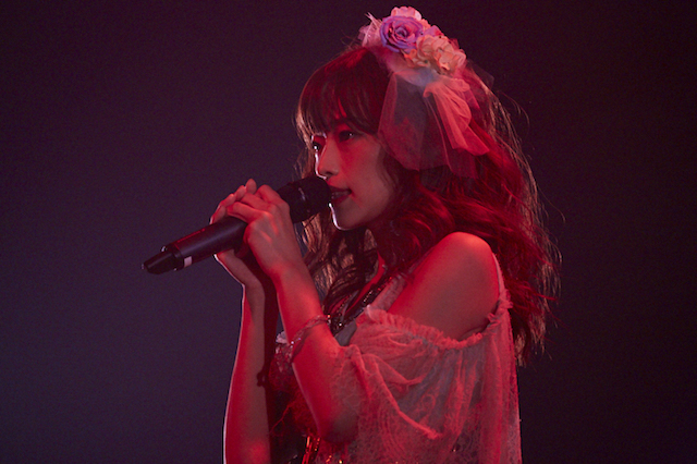 そこから「Flaming Rose」「KOTO-DAMA」「赤いアネモネ」と、激しめかつロック調の楽曲が続くパートで、カッコいい一面をしっかりと見せつける。振り付けも前回のバースデーイベント時より複雑で色気のあるものになっており、はっきりとその進化を目の当たりにすることができた。かと思えば、MCで「『KOTO-DAMA』は『アウトローな映画を観てストレスを発散する』ってインタビューではお話したんですけど、それは表のテーマで、裏テーマは……」と、新曲の種明かしをして笑いを取ることも忘れない。