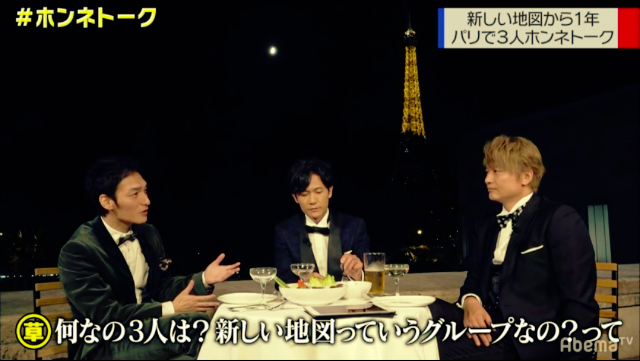 「ゼロになる覚悟だった」香取が個展を開いたフランス・パリで1周年を迎えていた3人は、今だから話せるホンネトークを1時間に渡って披露。「全然違うみんな顔が!」1周年を記念して作られたムービーに収められた、新しい地図スタート時の自分たちを見て、香取がそうつぶやく。きっと見ていたすべての人が同じ感想を持ったことだろう。「新しい地に降り立って周りを伺ってるみたいな」と稲垣が例えたように、どこか不安げで、それでも前を向こうと心を奮い立たせる表情は、今の生き生きとした彼らの顔と全く違う。当時いろんな憶測が飛び交い、ホンネは誰にも聞かれないようにこっそりと静かに話し合っていた3人。昔から彼らを知るスタッフが集まって、新しい地図を始めるというタイミングでさえ、「いいんだよね? この人たち」と、彼らの中にはそんな憂心を抱いていた、と語られた。