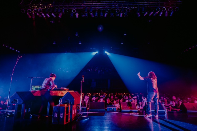 再びリスナーをズッコケさせるようなMCをはさみ、Creepy Nutsのライブの定番とも言えるパートに突入。観客からのお題を集め、それをフリースタイルの中に織り込んでいく“聖徳太子フリースタイル”では、今回は9個のお題を集め、見事に成功。続くDJ松永のターンテーブルライブ/DJルーティンでも観客を沸かす。やはり彼らの根本の強さを感じるのは、こういった純粋に“スキルフル”な部分だろう。楽曲の構成や展開の妙も勿論あるが、そもそも単純にラップスキル、DJスキルが彼らは異常に高く、それはR-指定の『UMB』三連覇や、DJ松永の『DMC JAPAN FINAL』進出といった“称号”にも事実として現れている。そして、それが彼らの楽曲やライブの背骨の強さとなっているだろうし、ワンマンだけではなく、フェスや対バンでもしっかりと観客をロックする所以だろう。