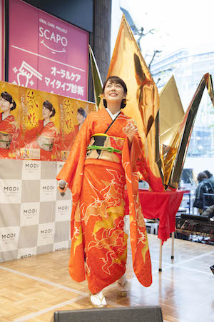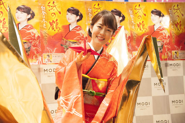 2月13日に新曲『紙の鶴/能登は冬色』を発売した演歌歌手の丘みどりが、2月15日に東京・渋谷MODI入口特設ステージにて、『紙の鶴』発売記念フリーライブを開催した。3メートルの紙で折られたという巨大な金色の折り鶴が飾られたステージに、オレンジ色の華やかな振り袖をまとった丘が現れると、彼女の明るく温かいオーラが会場を包み込んだ。当日は雪が舞い散る真冬日という生憎の天候にも関わらず多くのファンが詰めかけ、丘は「大丈夫ですか?」と集まったファンを気づかいながら「紙の鶴」と「能登は冬色」を熱唱。寒さを吹き飛ばす情熱的な歌声でファンを魅了し、道行く人も足を止めてしばし歌声に聴き惚れていた。