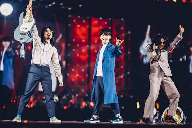 今回、ライブ本編は大きく分けて三段構成となっていた。開演から「ドラえもん」までの前半部分。それから幕間映像を挟み、セカンドステージでの「ばらばら」から「くせのうた」までが中盤部分。再び幕間映像を挟んで、「化物」から始めて「恋」や「SUN」「アイデア」といったヒットナンバーを経由して「Family Song」へと着地させるラストスパートの終盤部分。特に中盤では『POP VIRUS』ツアーならではの試みが行われ、前半からの流れに変化を与えていた。終盤はヒット曲を畳み掛けることで会場の興奮をこれでもかと押し上げていた。こうして公演の中に起承転結をしっかりと生んだことで、観客を終始飽きさせないライブ作りが行われていた。