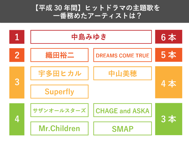 平成30年間のヒットドラマ、もっとも多く主題歌を務めたアーティストは? 上位150作を調査