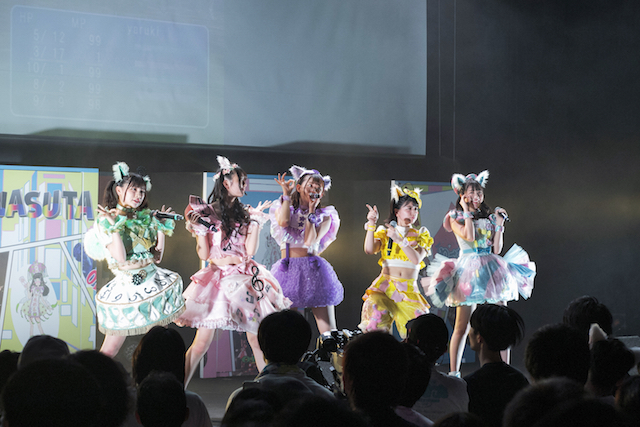 「ぶっ倒れるくらい一緒に盛りがって行きますか?」という廣川の言葉から「うるとらみらくるくるふぁいなるアルティメットチョコびーむ」が放たれる。ピコピコハンマー、ならぬ、伝説の剣「エクスカリにゃん」を三品が客席に投げ入れ、“とりお君”とハッピーエンドを迎えた、……のだが、スクリーンに映し出された“Nyantendo”のロゴから、続きの物語「くらえ!必殺!!ねこパンチ★ ~私達、戦うにゃこたん【レベル5】~」へと突入。謎の難病にかかってしまったとりお君を守るため、大繁殖した“きゅうり妖怪きゅりり”と壮絶な(?)戦いを繰り広げる、わーすたワールド全開の摩訶不思議なゲームファンタジーの世界へといざなわれていく。スクリーンのゲームバトル画面とめまぐるしく展開していく楽曲含め、一見ちょっと何が起こっているのかよくわからないこの世界観であるが、彼女たちの確かな歌唱力とパフォーマンスによって、自然と引きずり込まれてしまうのである。