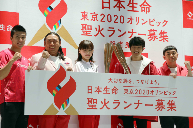 6月17日、都内にて『日本生命 東京2020オリンピック聖火ランナー募集 記者発表会』が開かれ、「チームニッセイ」メンバーである女優の綾瀬はるか、お笑い芸人のロバート・秋山竜次、陸上の桐生祥秀選手、そしてテーマソングを担当するフォークデュオ・ゆずの北川悠仁と岩沢厚治が登壇。聖火ランナーへの応募を呼びかけた。